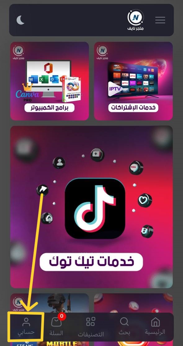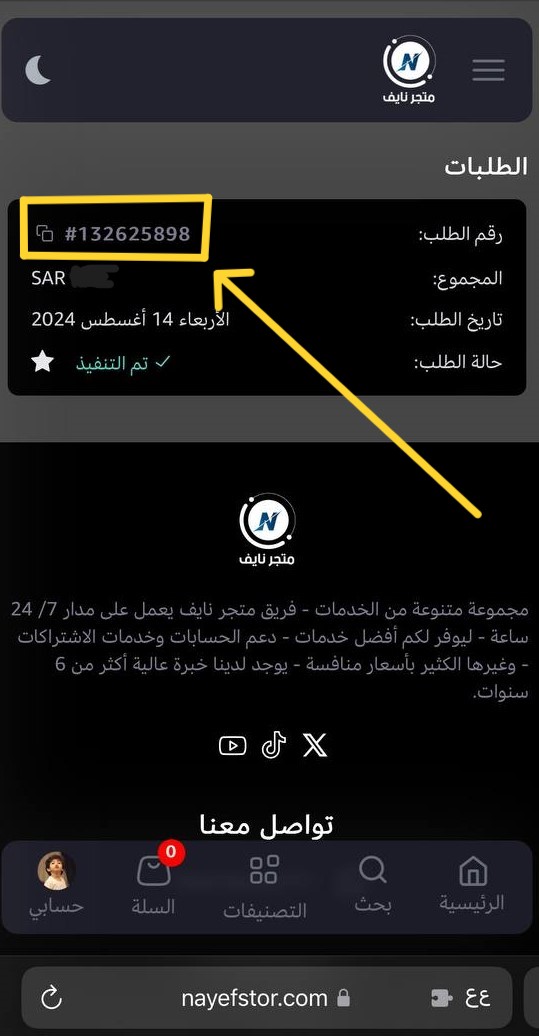 - قم بتسجيل الدخول إلى حسابك في متجر نايف باستخدام رقم الجوال او البريد الإلكتروني الخاصة بك.