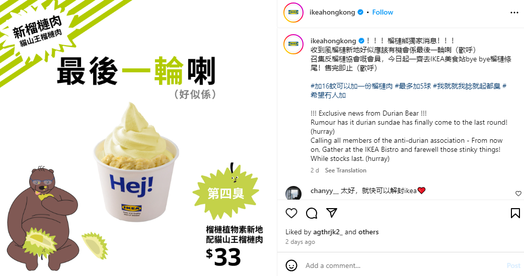 تتخصص متاجر ايكيا البالغ عددها 483 متجراً في جميع أنحاء العالم في الأثاث الذي يمكن تجميعه بنفسك، ولكنها تصنع منتجات خاصة بمناطق معينة ، ومنتجات غذائية يتم بيعها في المقهي الخاص بها لأسواق مختلفة. وتمتلك شركة ايكيا أيضًا حسابات متعددة مخصصة للمنطقة عبر إنستغرام وإكس (المعروف سابقًا باسم تويتر) ومنصات أخرى. وإليكم منشورًا على صفحتهم على إنستغرام في هونغ كونغ، للترويج لنكهة جديدة من الآيس كريم من الدوريان (نوغ فاكهه) في المقهى الخاص بهم.