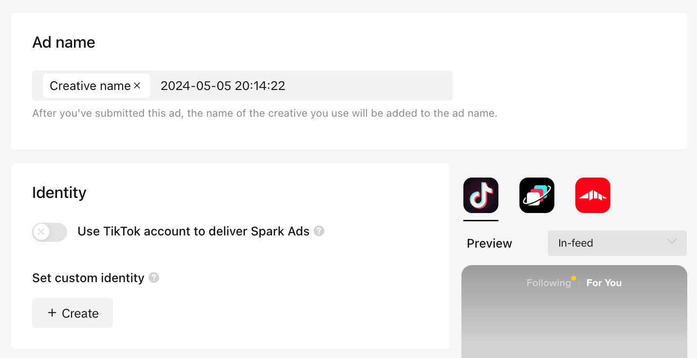 يمكنك تخصيص إعلانك بشكل أكبر عن طريق تسميته بحيث يسهل التمييز بين الإعلانات المختلفة ضمن نفس مجموعة الإعلانات. ويمكنك أيضًا اختيار ما إذا كنت تريد أن تأتي إعلاناتك من حسابك على TikTok أو من هوية مخصصة تتضمن صورة ملف تعريف مخصصة واسم مخصص.