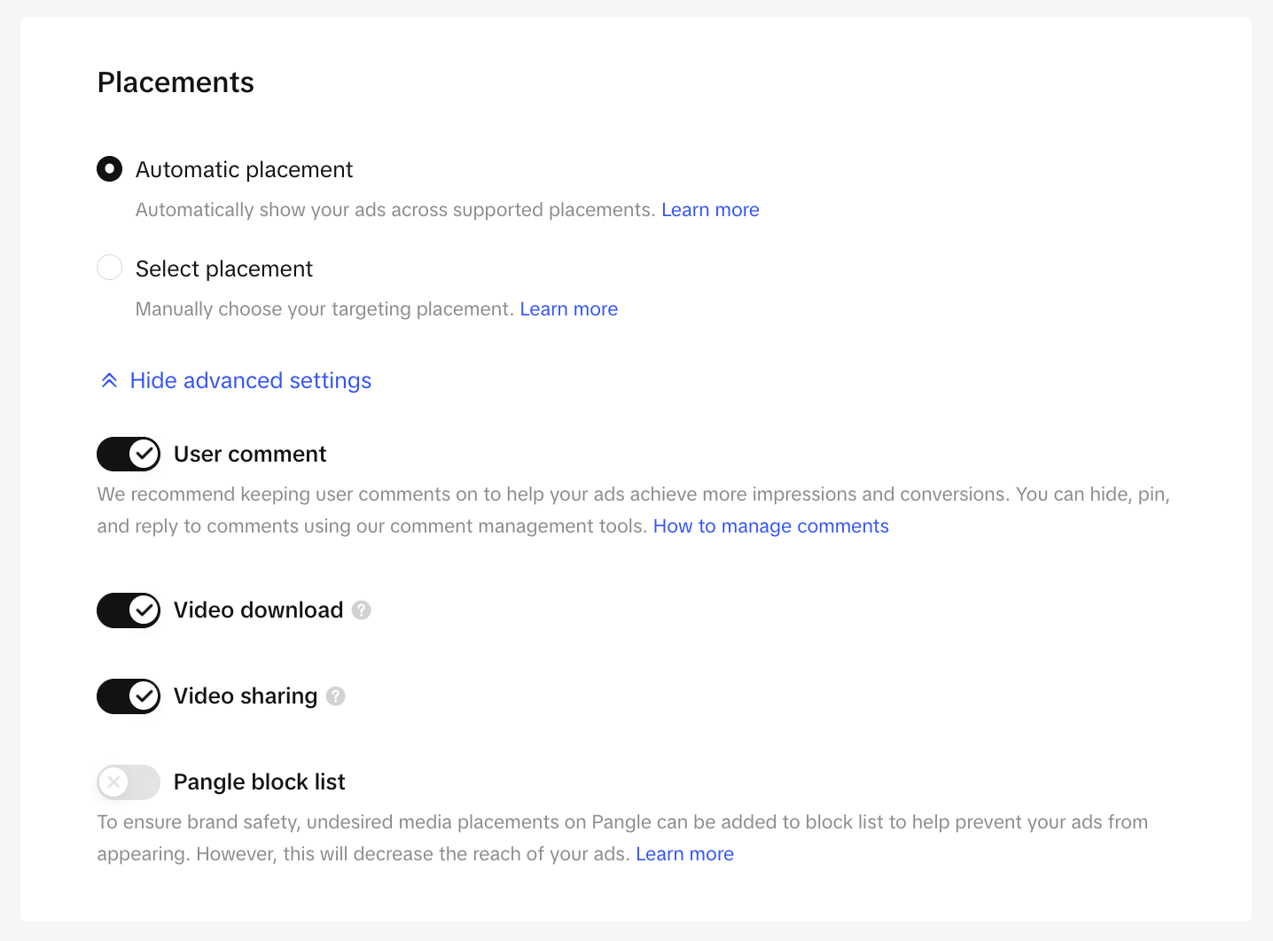 سيحدد اختيارك لموضع الإعلان مكان ظهور إعلاناتك على تيك توك TikTok ومنصات الشركاء، مثل CapCut أو Fizzo . وإذا كنت قد بدأت للتو في استخدام إعلانات تيك توك TikTok ads، فاختر "الوضع التلقائي Automatic placement" حتى يضع تيك توك TikTok إعلاناتك لتحقيق أقصى قدر من الوصول والقيمة. ويمكن للمستخدمين أيضًا وضع الإعلانات يدويًا عبر تيك توك TikTok وتطبيقات موجز الأخبار الخاصة به. وهناك أيضًا إعدادات أكثر تقدمًا مع خيارات لتمكين أو تعطيل تعليقات المستخدم وتنزيلات الفيديو ومشاركة الفيديو ومنع ظهور إعلاناتك في تطبيقات Pangle معينة.