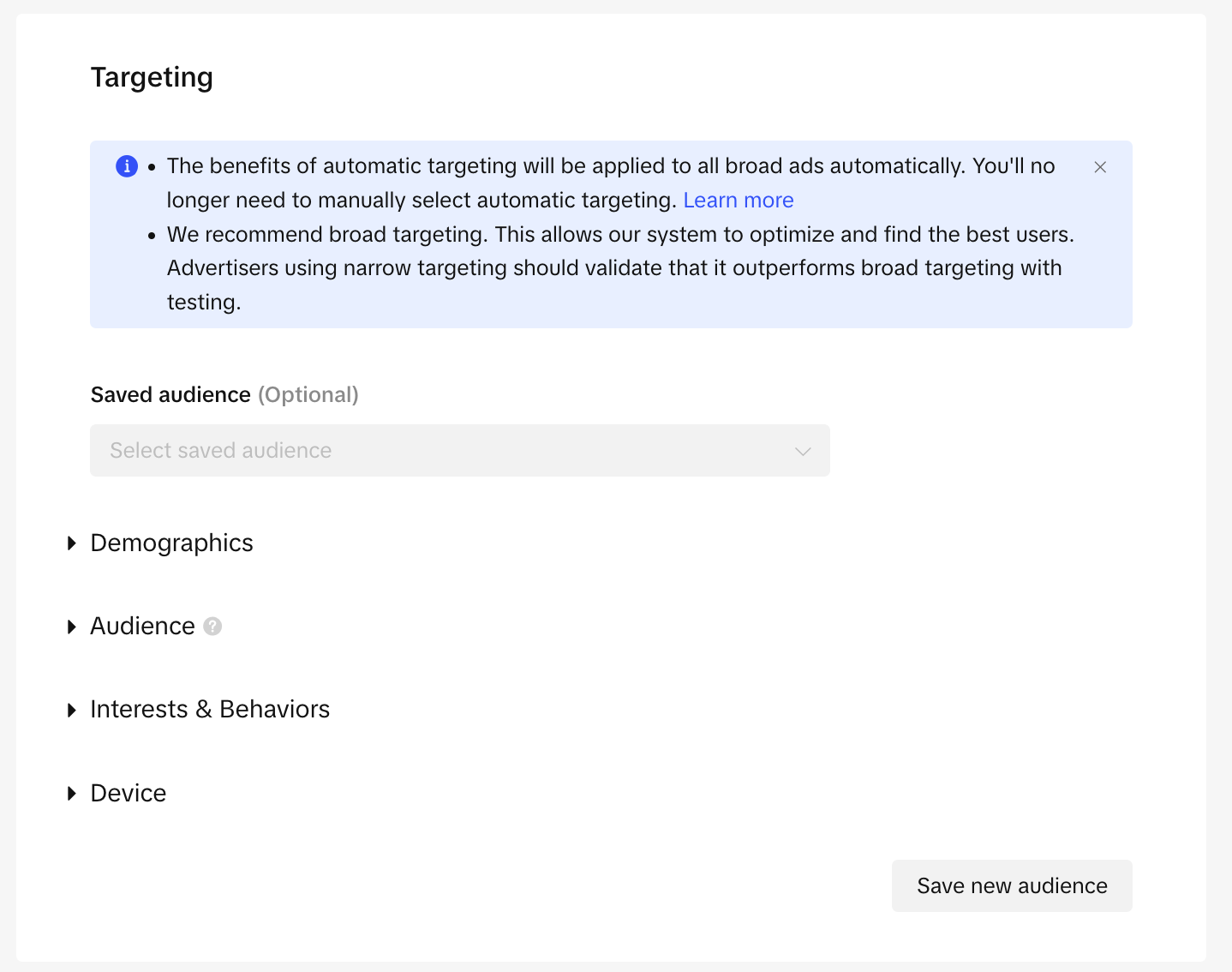 اختر الجمهور المستهدف لإعلانك من خلال تحديد التركيبة السكانية والجمهور audiences والاهتمامات والسلوكيات والجهاز المستخدم. وتحتوي كل فئة على قائمة منسدلة تحتوي على خيارات تخصيص إضافية. فعلى سبيل المثال، بالنسبة للتركيبة السكانية، يمكنك تحديد موقع جمهورك المستهدف وجنسه وعمره ولغته وقدرته الشرائية.