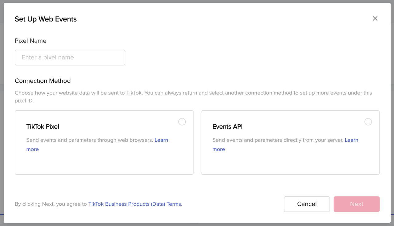 • حدد TikTok Pixel كطريقة الاتصال الخاصة بك، ثم اضغط علي التالي Next.