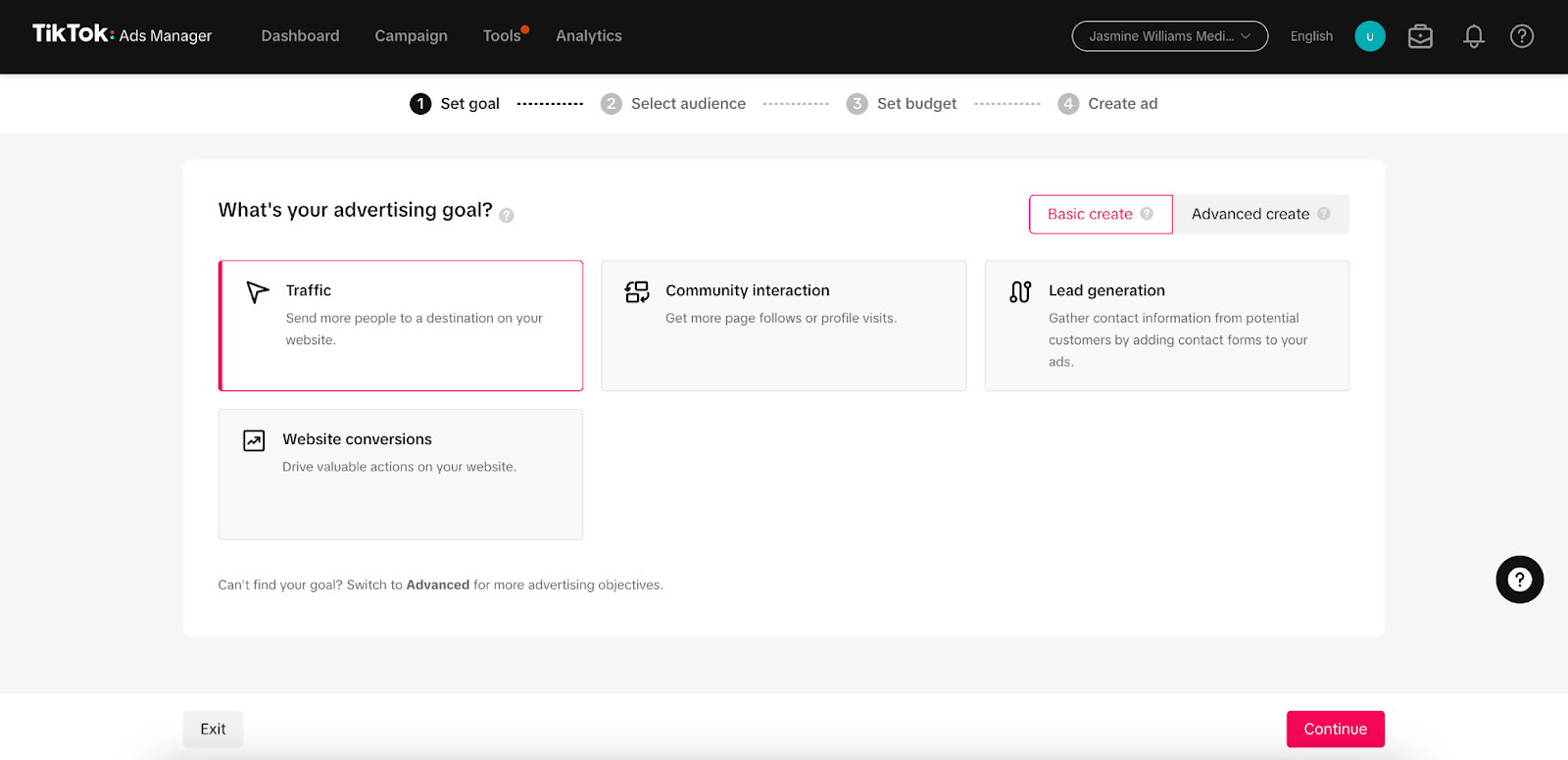وفي وضع الإعداد البسيط Basic يتم تبسيط عملية إنشاء وإعداد الإعلانات إلى أربع خطوات: تحديد هدف إعلاني، وتحديد الجمهور، وتحديد ميزانيتك، وإنشاء إعلانك.