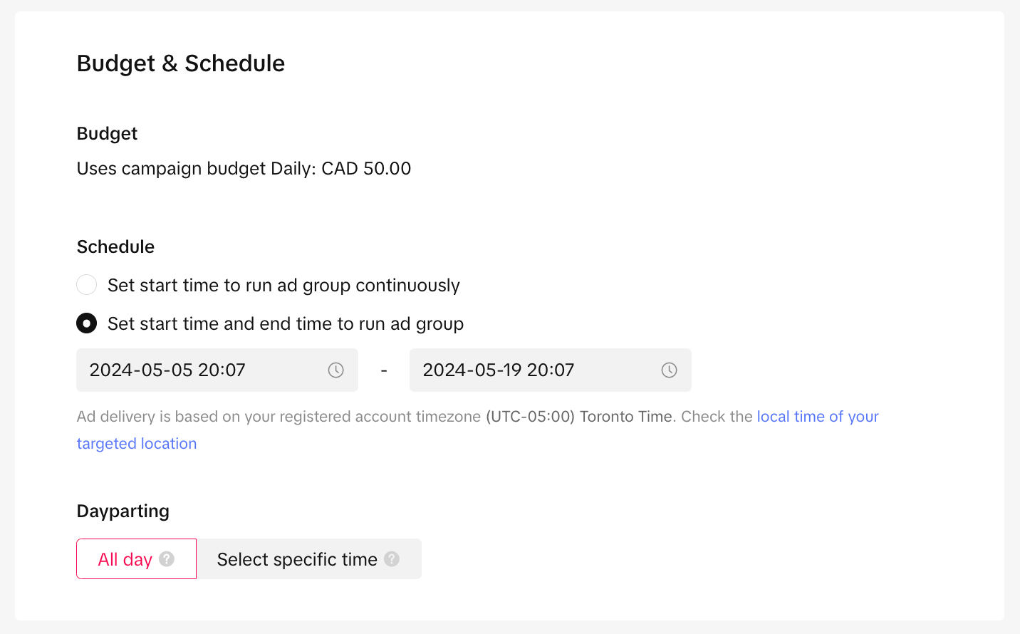 قم بتعيين وقت البدء والانتهاء لحملتك الإعلانية وما إذا كنت تريد تشغيل إعلاناتك طوال اليوم أو في أوقات محددة من اليوم والأسبوع.