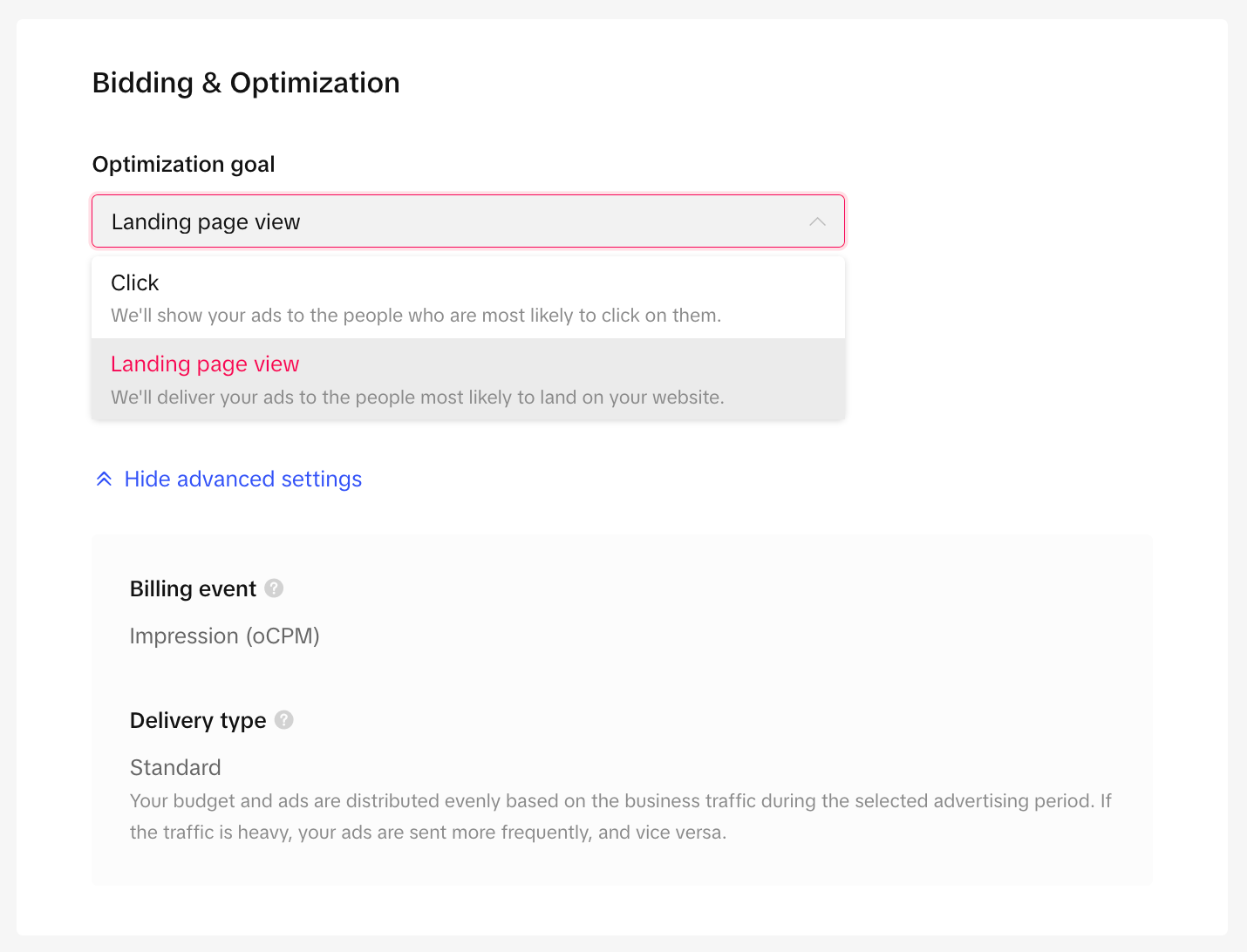 وتعمل معظم إعلانات تيك توك TikTok ads وفقًا لنموذج المزاد auction، حيث يحدد المستخدمون عرضًا وحدًا bid للإنفاق اليومي لحملاتهم. ومع ذلك، يمكن للمستخدمين أيضًا استخدام "الترويج" TikTok Promotion لتحويل المحتوى المنشوربغرض جلب مشاهدات مجانية إلى إعلان مدفوع.